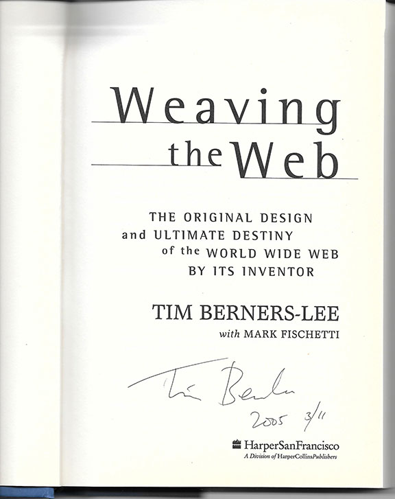 Weaving the Web, The Original Design and Ultimate Destiny of the World Wide Web by Its Inventor. Tim Berners-Lee. Harper, San Francisco, 1999, First Edition so stated. Two hundred twenty-six pages. In very fine condition with dust jacket. Signed with a fine inscription: “For Kids helping Kids” Tim Berners-Lee, 2005 3/11.” Excellent silver ink signature of Al Gore tipped in. Anything signed by Tim Berners-Lee can be considered quite uncommon. Another very similar copy with an inscription (less Gore’s signature) can be found on Abe Books selling for $1600. Our price...............................$375.00