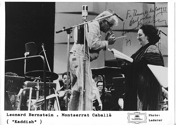 BERNSTEIN, Leonard (1918-1990) American conductor, composer, pianist. Considered one of the most important conductors of his time. First American conductor to receive international acclaim. His best-known work is for the Broadway Musical West Side Story. Uncommon photograph, 7”X9.5”, B&W, conducting in front of Montserrat Caballe, the Spanish soprano who is considered the best soprano of the 20th century. Bernstein is also known for his appearance with Freddie Mercury. The scene is from “Kaddish” which refer to a Jewish prayer that is chanted at every synagogue service for the dead. This symphony was a popular performance, Symphony #3, saw 54 performances with 28 in the orchestra including one soprano soloist across Asia, Europe and America. Inscribed, signed and dated: “For Thomas M. McCooper, Best wishes Leonard Bernstein, 79.” In fine condition.....................SOLD