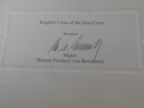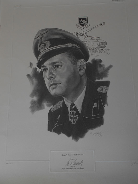 Maximilian Richard Hans Christoph Werner Freiherr von Beschwitz (19 January 1915 - 25 May 2011) was a highly decorated Major in the Wehrmacht during World War II and an Oberst (colonel) in the Bundeswehr. He was also a recipient of the Knight's Cross of the Iron Cross. The Knight's Cross of the Iron Cross was awarded to recognize extreme battlefield bravery or successful military leadership. Beschwitz joined the postwar Bundeswehr in 1956 and retired in 1973 as an Oberst. This print is numbered 149 of 500 copies.................SOLD