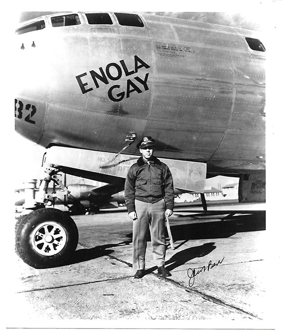 BESER, Jacob (1921-1992). Special Instruments Operator onboard both the Enola gay and Bockscar. The only crew member to fly on both Atomic Bomb missions. Stunning photograph, 8”x10”, B&W of the Enola Gay with Beser (full length) dressed in his flight jacket and hat, On the light portion of the runway, Beser has signed his name. A choice and uncommon photograph.............$75.00![]() |