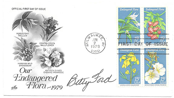 FORD, Betty (1918-2011) First Lady of the United States (1974-1977). Second First Lady (1973-1974). She was considered an influential First Lady. She battled alcoholism and later after recovering founded the Betty Ford Clinic. Attractive FDC commemorating Our Endangered Flora. Fine cachet of 4 different flowers that are endangered. Affixed to this cover are four 15 cent Endangered Flora stamps, cancelled First Day of Issue, Milwaukee, WI Jun 7, 1979. Signed with an attractive Betty Ford signature. In fine condition................$75.00