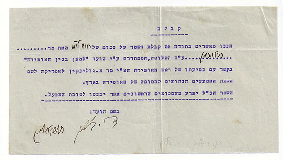 BIALIK, Hayyim Nahman (1873-1934). Ukrainian born Jewish poet. Considered the leading poet in Hebrew of modern times. Essayist, story writer who exercised a profound influence on modern Jewish culture. His poem “The City of Slaughter” written after the Kishinev pogrom (1903) roused the younger generation to take up arms in self-defense. He assumed a leading role in Jewish cultural life and became the symbol of the National Revival. His home in Tel-Aviv has been preserved as a cultural center. The Bialik Prize for best in Hebrew Literature is a symbolic monument to his memory. Typed receipt in Hebrew with two place filled in with his pen. Signed in Hebrew by Bialik and signed to his right by David Block who was an early Tel-Avivian. Signatures of Bialik are quite scarce. In fine condition..................................$575.00