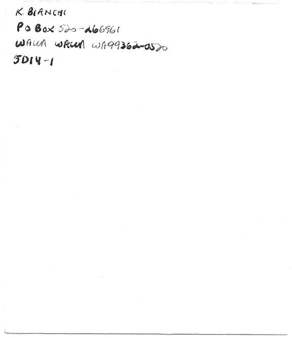 BIANCHI, Kenneth (1951- ) American serial killer, rapist and kidnapper. Serving a life sentence. Sexually abused 12 victims before strangling them. Bianchi is also suspect in the alphabet murders of three. While committing the murders, Bianchi applied for a job with the Los Angeles Police department. Portion of an envelope sent from prison where the murderer has printed his name, prison number and return address. Items signed by Bianchi are seldom offered in the autograph marketplace..............................$95.00