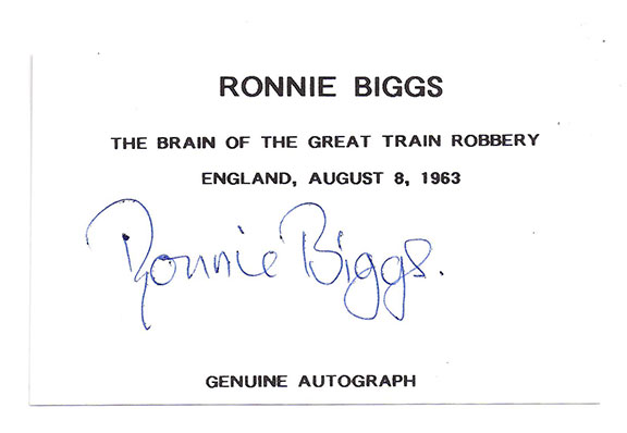 Card, white, 3”x5" with printed statement, “Ronnie Biggs, The Brain of the Great Train Robbery, England, August 8, 1963, Genuine Autograph” hand signed by Ronnie Biggs. In excellent condition. Genuine autographs of Ronnie Biggs are considered scarce .........................SOLD