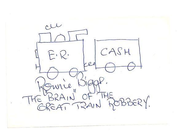 BIGGS, Ronnie (1929-Dec.18, 2013). Notorious British criminal who became known as “The Brain of the Great Train Robbery”. The robbery was of a Royal Mail Train traveling from Glasgow to London. The robbery netted about $4 million dollars which is about $65 million today. Biggs escaped from prison and evaded Scotland Yard for over 3 decades. The robbery is most likely the most famous in British history. Biggs lived in Brazil for many years never answering all his fan mail. Original sketch of the mail train by Ronnie Biggs. Measures appx. 4”x6.5”. The engine is identified as “E.R.” (Elizabeth Reigning) and the second car is identified as “Cash”. Boldly signed “Ronnie Biggs, The Brain of the Great Train Robbery.” Only four of these sketches were ever made ..............$550.00