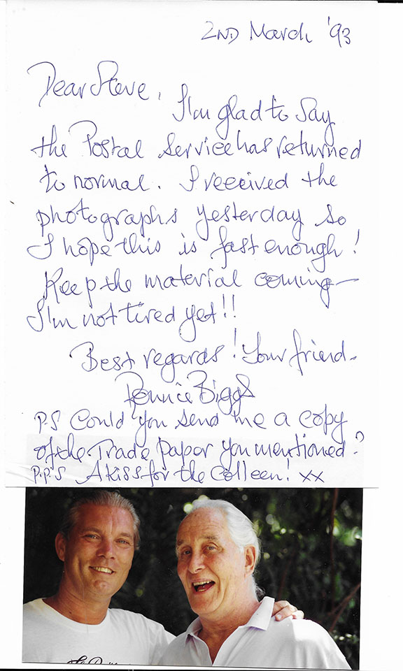 BIGGS, Ronnie (1929-Dec.18, 2013). Notorious British criminal who became known as “The Brain of the Great Train Robbery.” The robbery was of a Royal Mail Train traveling from Glasgow to London. The robbery netted about $4 million dollars which is about $65 million today. Biggs escaped from prison and evaded Scotland Yard for over 3 decades. The robbery is most likely the most famous in British history. Biggs lived in Brazil for many years never answering any of his fan mail. Excessively rare autograph letter signed, one full page, 2nd March ’93. Biggs writes: “Dear Steve, I’m glad to say the Postal Service has returned to normal. I received the photographs yesterday, so I hope this is fast enough! Keep the material coming-I’m not tired yet!! Best regards! Your friend Ronnie Biggs. P.S. Could you send me a copy of the trade paper you mentioned? P.P.S A kiss for the colleen! XX.” In excellent condition......................$225.00