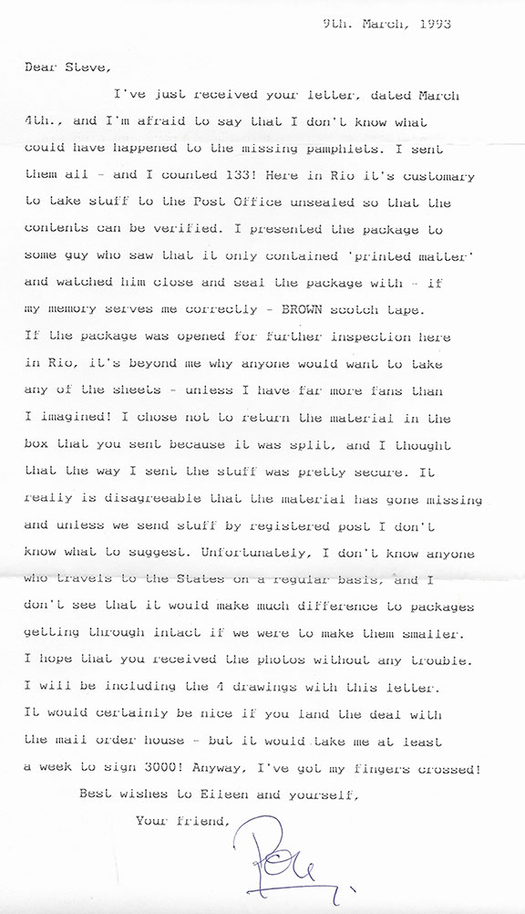 BIGGS, Ronnie (1929-Dec.18, 2013). Notorious British criminal who became known as “The Brain of the Great Train Robbery.” The robbery was of a Royal Mail Train traveling from Glasgow to London. The robbery netted about $4 million dollars which is about $65 million today. Biggs escaped from prison and evaded Scotland Yard for over 3 decades. The robbery is most likely the most famous in British history. Biggs lived in Brazil for many years never answering all his fan mail. Rare, typed letter signed, one very full page, 9 March 1993. Biggs types a letter to “Steve” his autograph agent, “...I don’t know what could have happened to the missing pamphlets. I sent them all - and I counted 133! Here in Rio it’s customary to take stuff to the Post office unsealed...if the package was opened for further inspection here in Rio, it’s beyond me why anyone would want to take any of the sheets unless I have far more fans than I imagined!...I hope you received the photos without any trouble. I will be including the 4 drawings with this letter. It would be certainly nice if you land the deal with the mail order house - but it would take me at least a week to sign 3000! Anyway, I’ve got my fingers crossed!....Your friend, Ron.” Two mailing folds otherwise in fine condition. In Ronnie’s house in Rio he had a cabinet full of fan letters. Each pile wrapped with string. None of which was answered. Anything signed by him can be considered Rare. Photo of Steve Koschal and Ronnie Biggs included......................$175.00