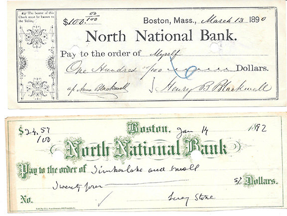 Matching Checks of Henry Blackwell and His Wife Lucy Stone STONE, Lucy (1818-1893). Reformer, a pioneer in the women’s rights movement. She helped establish the American Women Suffrage Association. She edited the leading suffrage paper “Women’s Journal”. She was prominent in the founding of the American Equal Rights association in 1866. Pair of matching checks, partly printed A.D.S., Boston, March 13,1890. North National Bank check payable to “Myself” for $100.00. Accomplished entirely by the hand and signed by Henry B. Blackwell including the words “a/c Anna Blackwell” and signed once again on the verso. Two bank punch hole cancellations not affecting any of the writing. Partly printed A.D.S., Boston, Jan. 14, 1892, North National Bank check payable to Timberlake and Small for $27.57. Accomplished entirely by the hand and signed by Lucy Stone. Two bank punch cancellations holes not affecting any writing. Both checks are in fine condition. Checks signed by Blackwell and Stone can be considered quite scarce. The pair......... $575.00 ![]() |