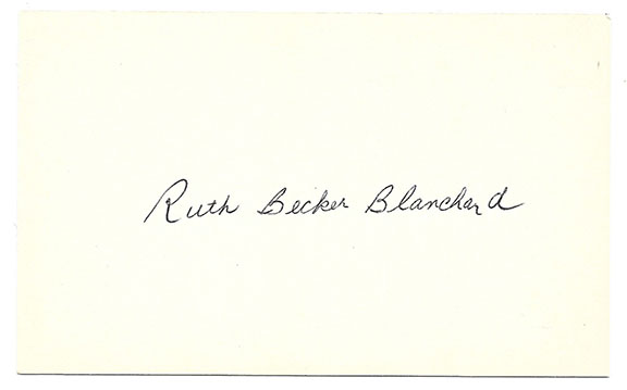 BLANCHARD, Ruth Becker (1899-1990). Born in India she was booked in Cabin #8, Deck “F” on the RMS Titanic. She was forced to stand in crowded Life Boat #13. She was saved by the Carpathia. Choice signature, well centered on a 3”x5” card. Signatures of Blanchard are quite uncommon as she did not start talking about her experience until 1982. She died eight years later....................$95.00![]() |