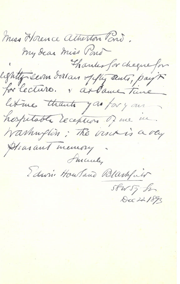BLASHFIELD, Edwin Howland (1848-1936). Great American artist noted for many important works including the great central dome of the Library of Congress, the New York Waldorf Astoria ballroom ceiling, parts of the Capital Building. Known as the “Dean of American Muralists.” Winner of many awards. Autograph letter signed, one page, Dec. 23, 1893 to Miss Atherton Pond. He writes in part: “Thanks for your check for eighty-seven dollars....payment for lecture. And at the same time let me thank you for your hospitable reception of me in Washington. The visit is a very pleasant memory. Sincerely, Edwin Howland Blashfield.” Anything signed by Blashfield has become rather scarce and to find his signature signed in full is extremely desirable. In fine condition .............$150.00