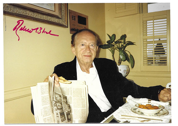 BLOCH, Robert  (1917-1994)  Writer of hundreds of stories and 30 novels. Multi award-winning author. Best known for his 1959 horror novel Psycho. A first edition of Psycho signed recently sold for $3,000.  Color photograph 3.5”x5” of Bloch sitting at his dining room table holding a newspaper and ready to eat. Boldly signed in red ink. An unusual informal pose. Somewhat scarce as such.............