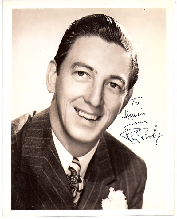 BOLGER, Ray (1904-1987). American film actor, dancer. Best remembered for his role as the “Scarecrow” in The Wizard of Oz (1939). Handsome vintage photograph of a young Bolger, 8”x10”, B&W, head & shoulders pose, smiling. Inscribed and signed on the light background of the photograph thus offering excellent contrast.............................. $165.00 |