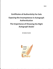 Koschal, Stephen Certificates of Authenticity For Sale, Exposing the Incompetence in Autograph Authentication, The Importance of Choosing the Right Autograph Dealer. First Edition, 2019, heavily illustrated.