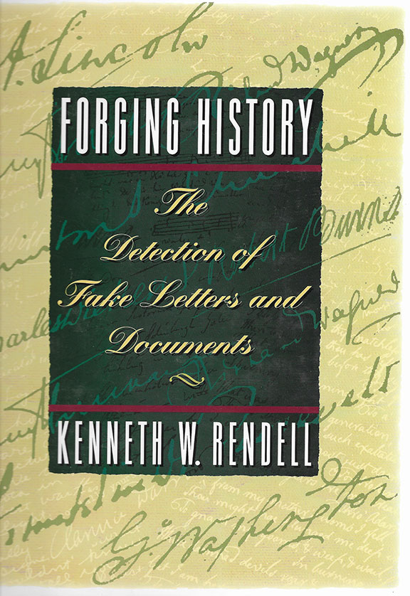 RENDELL, Kenneth W. (1943- ) Rare and historical documents dealer. “Forging History, The Detection of Fake Letters and Documents.” University of Oklahoma Press 1994, First Edition. One hundred seventy-one pages very heavily illustrated. In very fine to near new condition. Original dust jacket. Signed by Ken Rendell on the title page. A must for every collector/dealer in autographs. $65.00