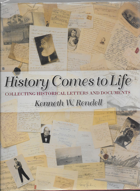 RENDELL, Kenneth W. (1943- ) Rare and historical documents dealer. “History Comes to Life, Collecting Historical Letters and Documents.” University of Oklahoma Press, First Edition 1995 two hundred seventy-nine page, very heavily illustrated. This treasure covers most all areas of collecting autographs. Fascinating and educational reading. V/F condition with the original protected dust jacket. $60.00