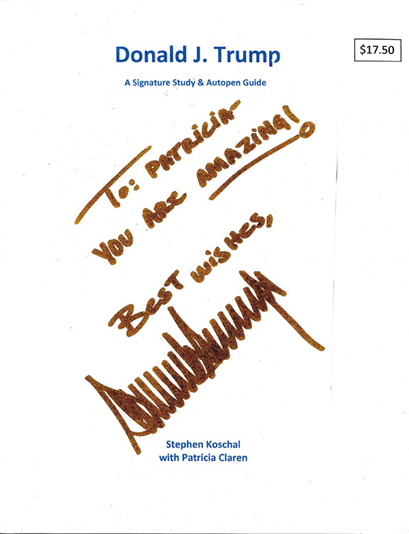 Award winning author Stephen Koschal along with Patricia Claren have put together a treasure trove of information regarding the signature of Donald J. Trump. This First Edition is limited to only 100 numbered copies with the first 25 signed by both authors.
