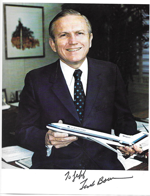 BORMN, Frank (1928-2023) American astronaut, a hero of the American Space Odyssey. He was an Apollo 8 and Gemini NASA astronaut. Color photograph, 8”x10” holding a Eastern Airline model Whisperjet taken from when he was the Chairman and CEO. On the lower white margin he has inscribed and signed “To Jeff Frank Borman.” In excellent condition .............$175.00