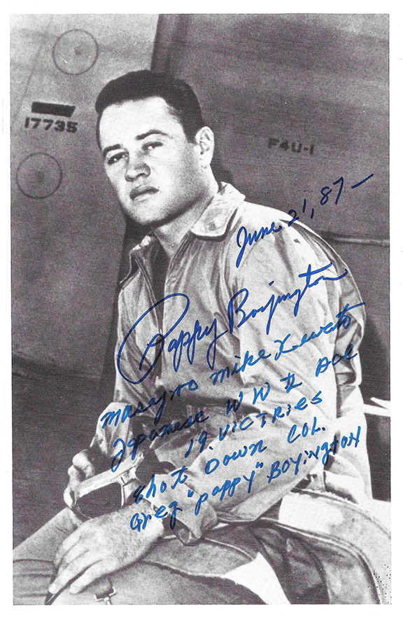 BOYINGTON, Col. Gregory “Pappy” (1912-1988). American fighter pilot during WWII. USMC, he flew with the Flying Tigers. He was the leader of the Black Sheep Squadron. An Ace he is credited with a confirmed 28ictories. He received both the Medal of Honor and the Navy Cross.
