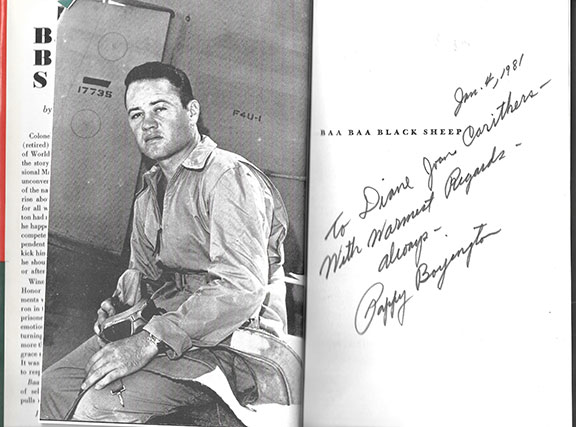 BOYINGTON, Col. Gregory “Pappy” (1912-1988). Highly decorated American combat pilot. Marine Corps Ace credited with 26 victories. He led the legendary Black Sheep Squadron. Shot down by a Japanese Fighter Pilot, picked up by a Japanese submarine and spent 1.5 years as a Japanese prisoner of war. He was awarded the Medal of Honor but received a dishonorable discharge by Claire Chennault. Boyington’s book: “Baa Baa Black Sheep”, G. P. Putnam’s Sons, New York, 1958, Seventeenth Printing. Three hundred eighty-four pages, illustrated. The half title page is inscribed, signed and dated. “Jan.4,1981 To Diane Joan Carithers- With Warmest Regards -always- Pappy Boyington.” In fine condition with dust jacket...........$150.00