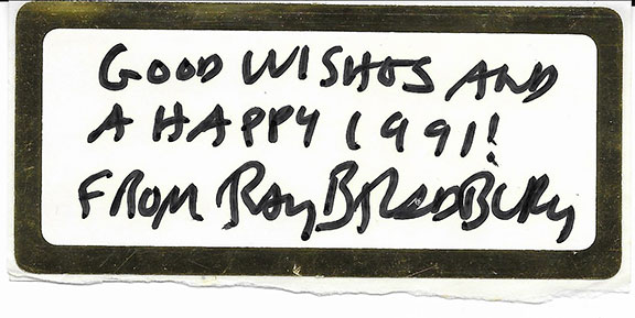 BRADBURY, Ray (1920-2012). One of the most celebrated authors of the 20th century. His modes of writing include fantasy, science fiction, horror, and mystery. He is mainly known for The Martian Chronicles (1950) and Fahrenheit 451 (1953). An unused label gold trimmed, 1.5”x3.75” where he writes: “Good Wishes and a Happy 1991! From Ray Bradbury,” Excellent for framing along with your favorite photograph.......$67.50 |
