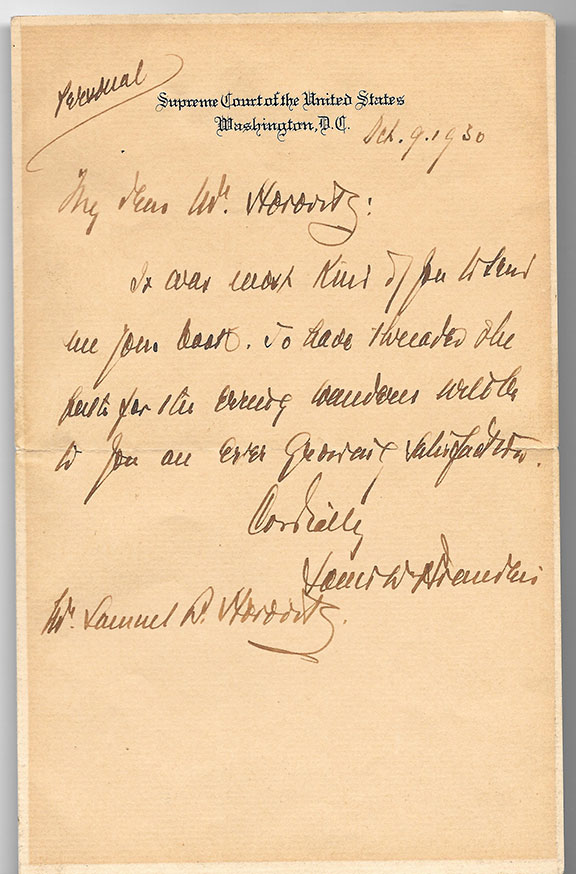 BRANDEIS, Louis (1856-1941). Appointed to the U.S. Supreme Court by Woodrow Wilson. Associate Justice of the U.S. Supreme Court (1916-1939). The controversy surrounding his nomination to the court caused the Senate Judiciary Committee, for the first time in history, to hold a public hearing. Four months passed between Wilson’s nomination and the Senate’s final confirmation. He became the first Jewish person on the high bench. He devised the savings bank insurance plans. Brandeis is featured on a U.S. Postage Stamp. Autograph letter signed, one page on the imprinted Supreme Court letterhead. Oct. 9, 1930 to Samuel Horowitz, marked “Personal.” Nice one page example sending thanks for Horowitz’s book, etc. Lightly tanned from prior framing however no fading...... $650.00