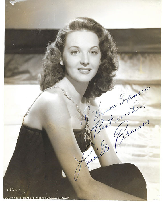 BREMER, Lucille (1917-1996). American film actress and dancer. Noted for Meet Me in St. Louis. Co-starred with Fred Astaire. MGM photo 7”x9” B&W half length pose smiling. Inscribed and signed: “To Vernon Hansen Best Wishes, Lucille Bremer”. One very small nick bottom right corner otherwise V/G/Fine condition..................$40.00![]() |