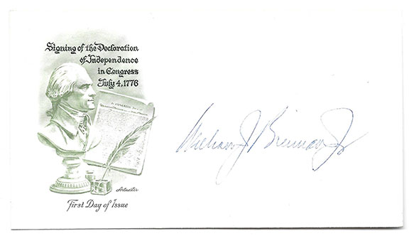 BRENNAN JR., William J. (1906-1997). Appointed by President Eisenhower to be an Associate justice of the U.S. Supreme Court (1956-1990). First Day Cover commemorating the Signing of the Declaration of Independence. Signed by Brennan with a fine signature........... $47.50 |