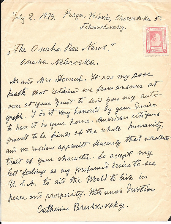 BRESHKOVSKY, Catherine (1844-1934). Russian Revolutionist. Named “Babushka” & “The Grandmother of the Russian Revolution”. Imprisoned and exiled by Czarist authorities. Autograph letter signed, one very full page, Prag, CZECHOSLOVAKIA, 7/2/1929. After responding to a request for her autograph she states: “American citizens proved to be friends as the whole humanity and we Russians appreciate sincerely that excellent trait of your character. So accept my best feelings as my profound desire to see U.S.A. to aid the world to live in peace and prosperity….” Signed in full. V/G..................................... $450.00