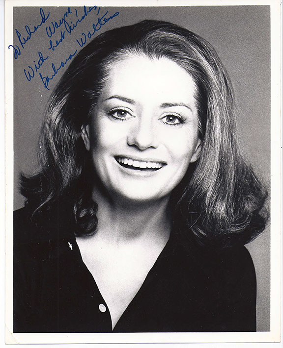 Roger Mudd (1928- ) Anchor for CBS Evening News and Nightly News. Host of NBC-TV’s Meet The Press. Anchor for The History Channel. Winner of 5 Emmy Awards. Lovely 7”x9” signed photo, signed in Dec. 1968. Dan Rather (1931- ) Former anchor for CBS Evening News. Embroiled in controversy about a news report involving President George W. Bush’s Vietnam service in the National Guard. Signed 7”x9” photo, signed in March 1969. Walter Cronkite (1916- 2009). Anchor man for CBS Evening News for 19 years (1962-81). Often cited as “The Most Trusted Man in America.” He reported many events from 1937 to 1981 including WWII, Nuremberg Trials, Vietnam War, Watergate, Iran Hostage Crisis, Assassination of President John F. Kennedy, The Beatles and the U.S. Space Program. Signed 7”x9” photograph. Signed in 1968. Frank Blair (1915-1995). Anchor for NBC News on the Today Show from 1953-1975. Signed 7”x9” photo. Signed in 1969. Harry Reasoner (1923-1991). Journalist for ABC and CBS. Founder of the “60 Minutes” program. Winner of 3 Emmy Awards. Typed letter signed on CBS News letterhead. Nov. 8, 1967 “..I’m glad you think I am one of the best newscasters...” Hugh Downs (1921- ) News broadcaster, anchor, actor, producer known for “The Jack Parr Tonight Show” (1957) and “20/20 (1978). He is one of the most familiar American television figures in the history of the news media. Recipient of many awards. Signed photograph, 3.5”x5’5”. Signed in 1969. Bryant Gumbel (1948- ) TV journalist and sports caster for 15 years. Co-host of NBC’s The Today Show. Signed 7”x9” photo. Signed in August 1982. Michael Snee (1925- ) Noted British Broadcasting Corporation journalist. Best known for his famous 13 minute interview with Paul McCartney (1964). Photograph of Snee with Big Ben in the background. Signed with a five word sentiment. Edwin Newman (1919-2010). Newscaster, author, worked in radio for CBS News and a 23 year career on television news with NBC (1961-1984). Photograph, 7”x9” signed with a sentiment, signed in 1969. John Hart (1932- ) Correspondent for CBS News and later in the 70’s anchored NBC News Update. Recipient of many awards. Photograph, 8”x10’ signed. Signed in May 71. Christopher Glenn (1938-2006) News journalist for CBS News. Spent his last 35 years with CBS. Anchored news coverage of the Space Shuttle Challenger. Photograph, 7”x9’ signed with two word sentiment. Signed in November 1972. Tom Snyder (1936-2007). Host of TV program “Tomorrow.” Pioneer anchor of prime time NBC News Update. Co-anchored the first noon news show in the U.S. Photograph, 7”x9” signed. Signed in December 1973. Jane Pauley (1950- ) American television anchor and journalist. Co-anchor for NBC’s Today Show. Photograph 7”x9” nice inscription signed. Signed in November 1979. Barbara Walters (1929- ) Broadcast journalist, author and television personality. Creator of ABC’s long popular daytime program “The View.” Photograph, 8”x10” inscribed and signed. Signed in April 1974. The collection..................$285.00 ![]() ![]() ![]() |