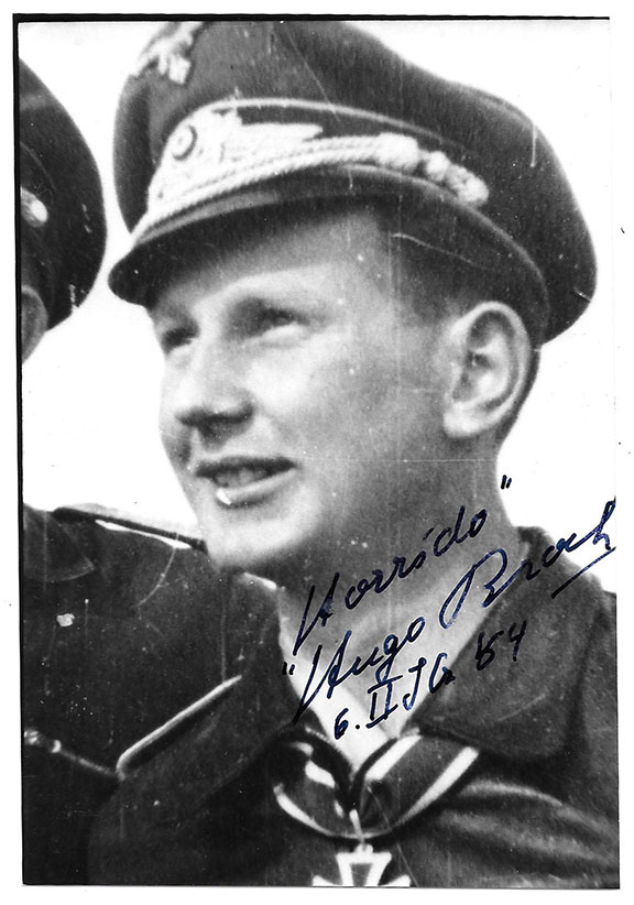 BROCH, HUGO (1922- ) German fighter pilot during WWII. Flew with the JG-54. Ace, credited with 81 victories. Photograph, 3.5”x5”, B&W, head and shoulders pose in uniform. Boldly signed adding his assignment. Fine condition......... $65.00 |
