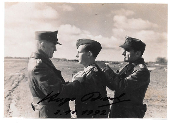 BROCH, Hugo (1922- ) German fighter pilot during WWII. Flew with the JG-54. Ace credited with 81 victories. Awarded the Knight’s Cross of the Iron Cross. Photograph, 3”x4”, B&W of Broch, side pose, receiving an award. Signed in full and dated “3.11.1992” in his hand. Adequate contrast........................... $35.00 |