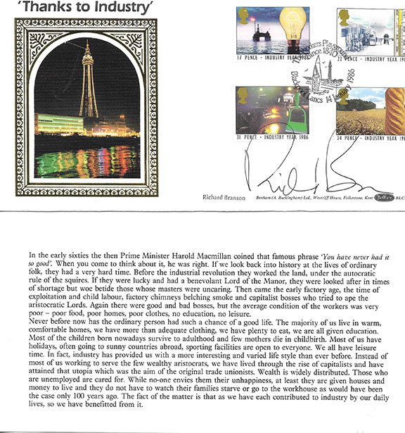 Branson, Richard (1950- ). English business magnate, co-founder of the Virgin Group in 1970. During 1972 he launched Virgin Records which became the world’s largest independent record label. He was knighted in 2000. In 2021 he travelled as a passenger onboard Virgin Galactic Unity 22 to the edge of space. Choice British cover honoring “Thanks to Industry.” Four “Industry Year 1986” stamps cancelled 14 January 1986. Desirable large genuine full signature “Richard Branson.” Printed information card enclose. In very fine condition...........$175.00