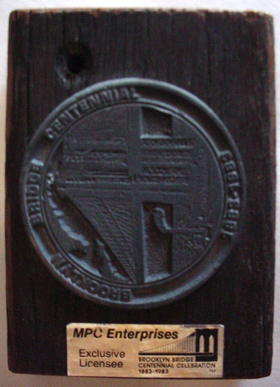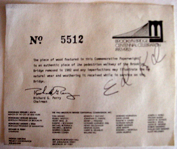 An AUTHENTIC chunk of wood made from the pedestrian walkway of the Brooklyn Bridge made into a paperweight. Removed in 1982 the wood may show imperfections which represents natural wear and weathering it received while in service from 1883. This highly desirable collectible was made for the Brooklyn Bridge Centennial Celebration (1883-1983). The accompanying certificate is registration #5512 and signed in print by the Chairman. The Certificate is also signed in ink by New York’s famous Mayor Ed Koch. His signature is an “in person” signature. The certificate and wood, measures appx. 1”x3”x4” is housed in its original box. In fine condition. Years ago a dealer was selling small pieces of wood, one inch square, from the bridge for $495. Our price for this large limited edition authorized collectible piece is............................SOLD