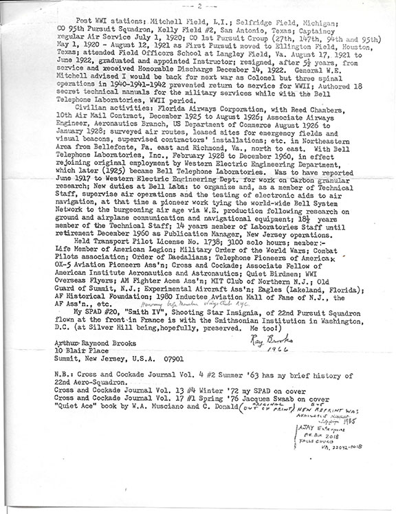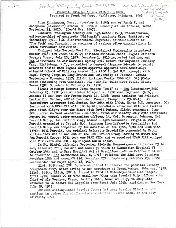 BROOKS, Capt. Arthur Ray. (1895-1991). American fighter pilot in WW1. Flew with the 139th and 22nd Sqdn/2nd Pursuit Group/AEF in France. Ace, credited with 6 victories. Brooks took on a squadron of German Fokker planes, single handedly and downed 5 of them in one aerial combat. Lengthy two page biographical sheet, most interesting. Brooks has inscribed and signed and dated this item at the top of page one. He writes: ”For Doug Miller from Ray Brooks, Oct.20, 1986. All Best. Please do not give out my address, at 91 I’m not able to respond further”......................................$87.50