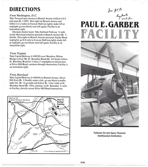 BROOKS, Capt. Arthur Ray. (1895-1991). American fighter pilot in WW1. Flew with the 139th and 22nd Sqdn/2nd Pursuit Group/AEF in France. Ace, credited with 6 victories. Brooks took on a squadron of German Fokker planes, single handedly and downed 5 of them in one aerial combat. Brochure of the Smithsonian Air & Space museum in Washington, DC. On the cover is a portrait of Brooks bi-plane. At the top of the brochure, Brooks has written: “For J.T.B., Ray Brooks, 26/3/86”. In fine condition.....................................$65.00