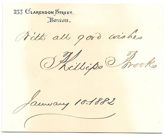 BROOKS, Phillips 91835-1893). American Episcopal clergyman and author. Rector of Boston’s Trinity Church & Bishop of Massachusetts. Remembered for his Christmas hymn “O Little Town of Bethlehem”. Card, 3.5”x4.5” with the printed address “233 Clarendon Street, Boston” (Trinity Church property).