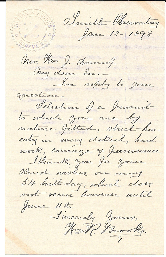 BROOKS, William R. (1844-1921). Astronomer. Founded the Red House Observatory in New York where he discovered 11 comets. He later discovered 16 additional comets making 27 in all. He was an early worker in photography and later used its application to astronomy. Very scarce autograph letter signed on his blind stamped name embossed stationery which depicts a comet sailing through the sky. Smith Observatory, Geneva, N.Y., Jan. 12, 1898. A wonderful letter offering words of wisdom. Also sends thanks for birthday wishes interestingly six months in advance. In fine condition....................... $250.00