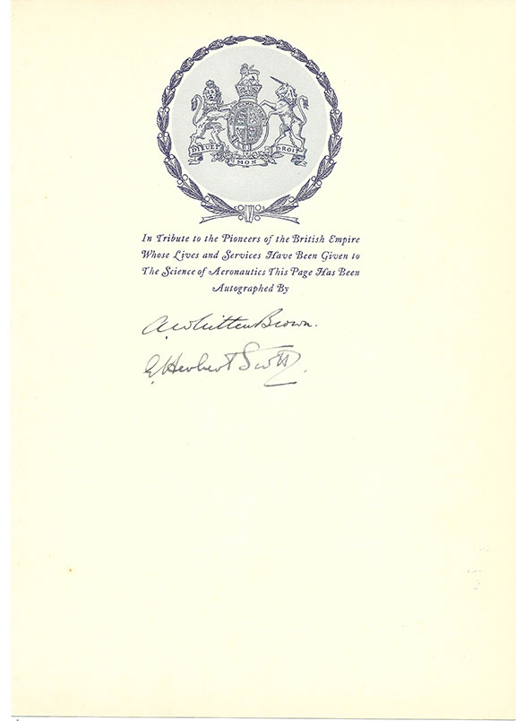 SCOTT, Major G. Herbert (1888-1930) English aeronautical expert who was the first to fly a lighter than aircraft across the Atlantic in 1919. The aircraft carried 31 persons including an American observer and a British stowaway. He devised a system of mooring airships at the head of the mast. Attractive printed leaf bearing the signatures of both pioneers below the Seal of The British Royal Arms followed by a printed legend being a tribute to the Pioneers of the British Empire whose lives have been given to the Science of Aeronautics. In very fine co.........$450.00