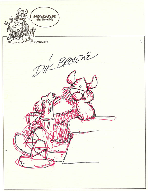 BROWNE, Dik (1917-1989). American cartoonist best known for writing and drawing Hagar the Horrible. Browne was the courtroom sketch artist at the Lucky Luciano trial. Browne created the logo for Chiquita. In 1973, Hagar the Horrible was born, he was an ill-mannered red bearded Medieval Viking. Browne was the recipient of many awards. On Hagar the Horrible printed letterhead Browne has drawn a color sketch of Hagar the Horrible in color, full length, holding a mug of beer and leaning on the arm of a sofa. Boldly signed “DIK’ BROWNE.’ A fabulous item for framing................................$775.00