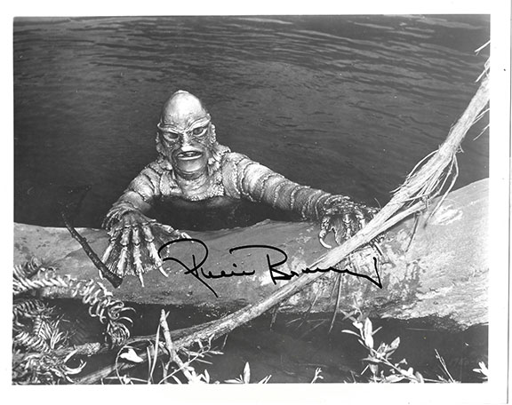 BROWNING, Ricoe (1930-2023) American film director, actor, producer, screenwriter, underwater cinematographer and stuntman. He was the creative force behind the movie and TV show Flipper. He is best known for his underwater scenes as the creature in the 1954 horror film The Creature From the Black Lagoon. Fabulous photograph, B&W, 8”x10” of Browning in Gill Man costume, coming out of the water. Boldly signed and in fine condition.........$137.50