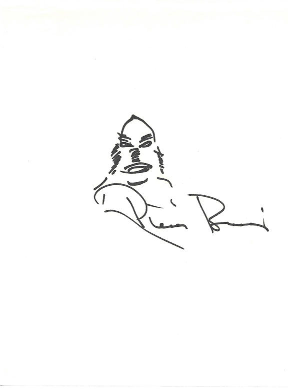 BROWNING, Ricoe (1930-2023) American film director, actor, producer, screenwriter, underwater cinematographer and stuntman. He was the creative force behind the movie and TV show Flipper. He is best known for his underwater scenes as the creature in the 1954 horror film The Creature From the Black Lagoon. Beautiful original pen sketch of “The Creature”, boldly signed in full. Overall size 8.5”x11”. A very attractive item for framing.........$225.00