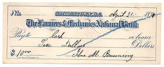 Bank check, Georgetown, DC, April 21, 1891, accomplished in Browning’s hand, made payable to “Cash” for ten Dollars. Boldly signed “John M. Browning”. A very scarce signature ...................................SOLD