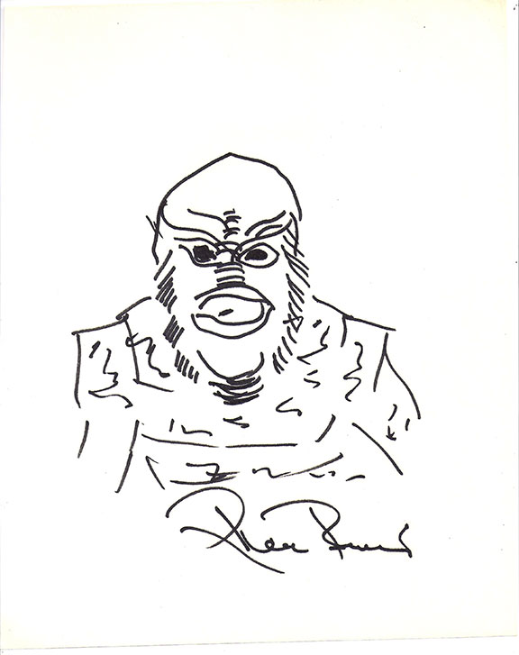 BROWNING, Ricoe (1930- ) American film director, actor, producer, screenwriter , underwater cinematographer and stuntman. He is best known for his underwater scene as the creature in The Creature From the Black Lagoon. Beautiful original pen sketch of “The Creature”, boldly signed in full. Overall size 8.5”x11”. A very attractive item for framing................SOLD |