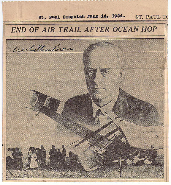 BROWN, A. Whitten (1886-1948) American aviator, on June 15, 1919 he made the first non-stop flight across the Atlantic. He flew from Newfoundland to Clifden, Ireland in 16 hours and 12 minutes. The distance was 1900 miles. The plane crash landed. Brown was Knighted afterwards. Newspaper photograph measures appx. 5.5”x6” of the plane crash with an inset, head & shoulders pose of Brown. Signed on the lighter portion of the photo offering excellent contrast. This is the first signed portrait of the crash scene that we have seen signed by Brown................. $450.00