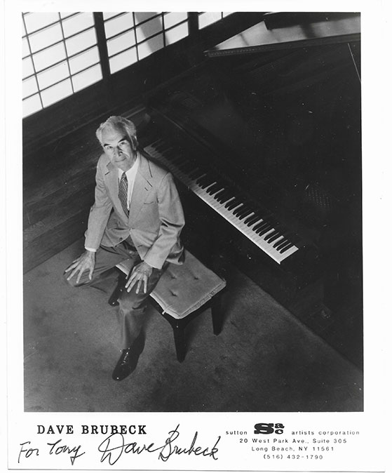 BRUBECK, Dave (1920-2012). American jazz pianist and composer. He is designated a “Living Legend” by the Library of Congress. An asteroid is named after him. Recipient of numerous awards. Wonderful, agents black and white glossy photograph, 8”x10” full length sitting near his piano. Inscribed: “For Tony Dave Brubeck.”.................$175.00 |