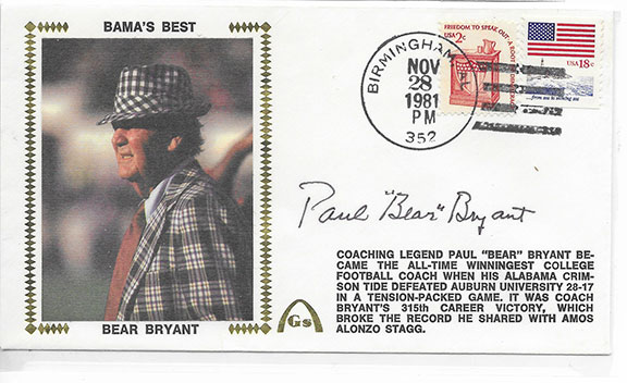 BRYANT, Paul “Bear” (1913-1083). American college coach. Longtime football coach for the University of Alabama. He held the most wins in collegiate history with 323 wins. Cover commemorating Bear Bryant with a choice cachet of the coach. Affixed are two US postage stamps cancelled Birmingham, AL, NOV 28,1981. Hand signed Paul “Bear” Bryant. In fine condition.....................$225.00![]() |