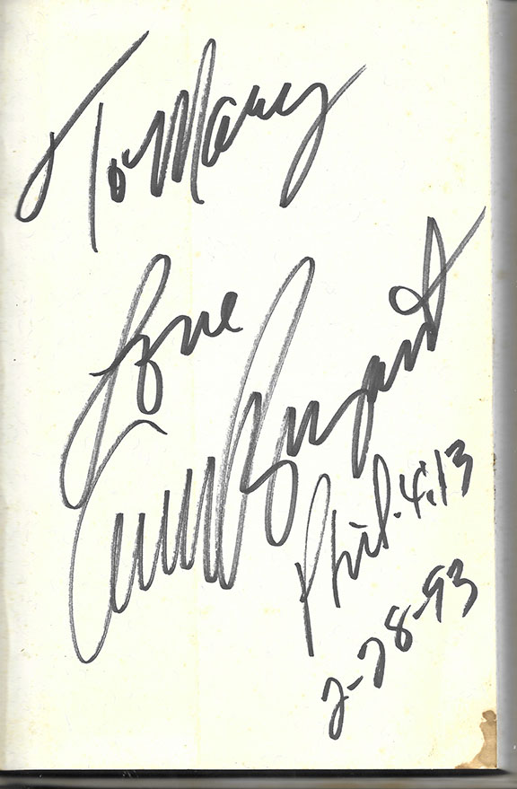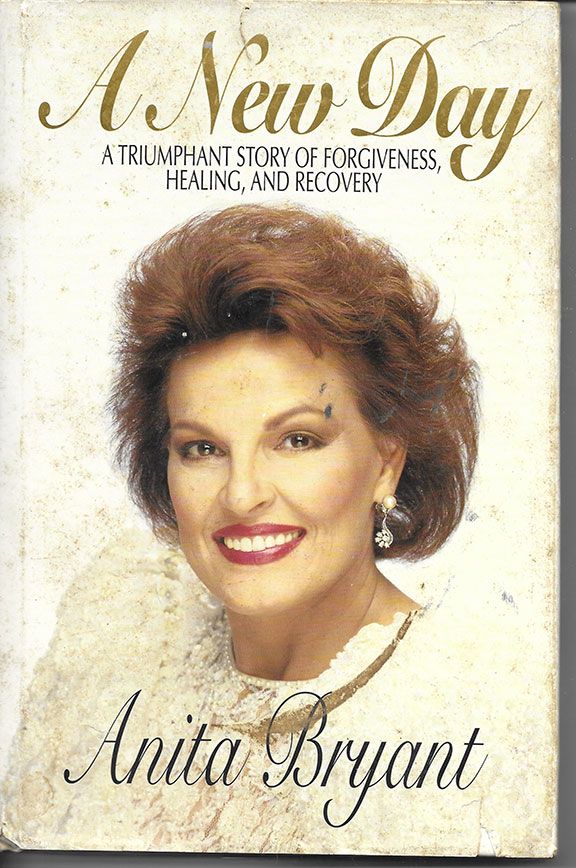 BRYANT, Anita (1940-2024). Singer, activist. At the age of 12 had her own TV show. Miss Oklahoma in 1958. Outspoken opponent of gay Rights. Singer released several albums. Some hits were “Till There Was You” and “Paper Roses.” She sang at the graveside services for President Lyndon B. Johnson. A New Day, A Triumphant Story of Forgiveness, Healing and Recovery. Broadman Press, two hundred eight pages with illustrations. Bold presentation inscription on the front free endpaper: “To Mary Love Anita Bryant 2-28-93.” Light foxing, one inch coffee stain bottom of front free endpaper and old fold bottom right corners of several pages. Good copy with dust jacket...........$15.00