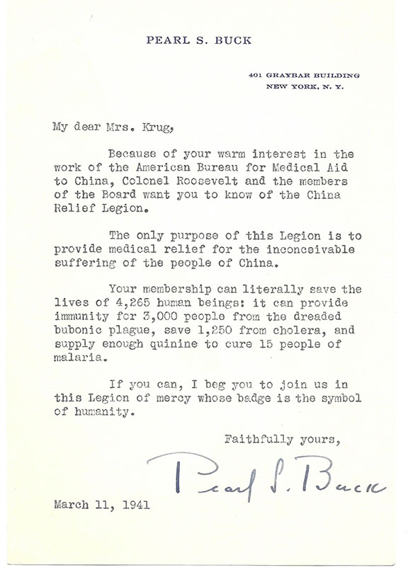 BUCK, Pearl S. (1892-1973). American writer and novelist. Best known for her best-selling novel The Good Earth (1931). First American woman to win the Nobel Prize in Literature (1938). T.l.S.one page on her name imprinted stationery. Dated, March 11, 1941 to My Dear Mrs. Krug. “Because of your warm interest in the work of the American Bureau for Medical Aid to China, Colonel Roosevelt and the members of the Board want you to know of the China Relief Legion. The only purpose of the Legion is to provide medical relief for the inconceivable suffering of the people of China. Your membership can literally save the lives of 4,265 human beings: it can provide immunity for 3,000 people from the dreaded bubonic plague, save 1,250 from cholera, and supply enough quinine to cure 15 people of malaria. If you can, I beg you to join us in this Legion of mercy whose badge is the symbol of humanity. Faithfully yours.” Signed, Pearl S. Buck. In very good to fine condition.........$325.00