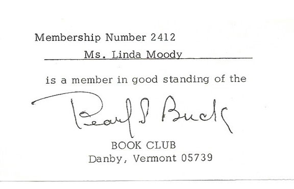 BUCK, Pearl S. (1892-1973). American novelist, awarded Nobel Prize for Literature  (1938); won Pulitzer Prize (1931) for “The Good Earth.”  Membership card #2412 for the Pearl S. Buck Book Club.  Ms. Linda Moody is a member in good standing. Signed in full by Buck,.  Choice and quite unusual Buck collectible................................