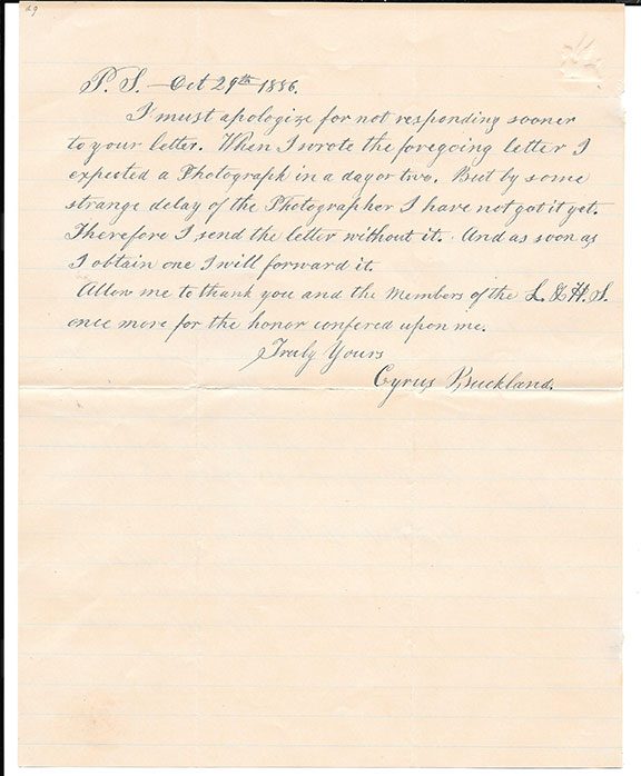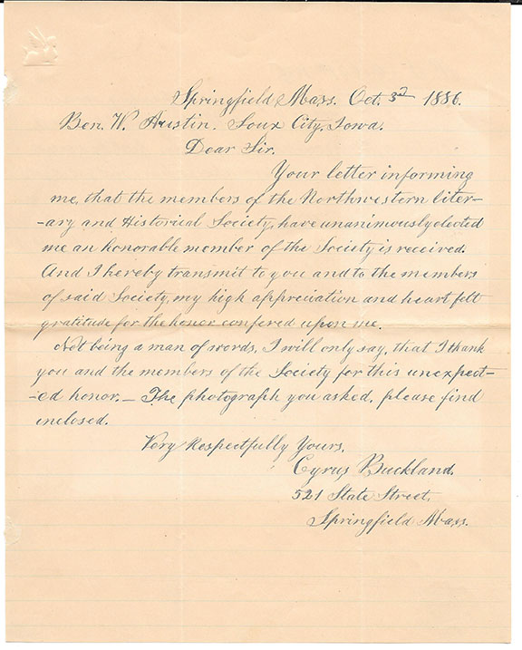 Two autograph letters signed on both sides of one sheet. Springfield, mass, Oct.3, 1886 to Ben W. Austin. Buckland states he is honored that members of the Northwestern literary and Historical Society have elected him an honorable member. He adds: “the photograph you asked, please find enclosed...” Signed in full. In a P.S.(Second ALS) Oct.29th 1886 he writes in part: “I must apologize for not responding sooner. When I wrote the foregoing letter I expected a photograph in a day or two. But by some strange delay of the photographer I have not got it yet. Therefore I send the letter without it. And as soon as I obtain one will forward it....” Signed once again in full. Photograph included. Fine condition. Letters from the hand of Cyrus Buckland are quite scarce..................................$295.00